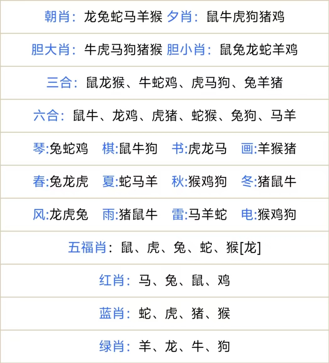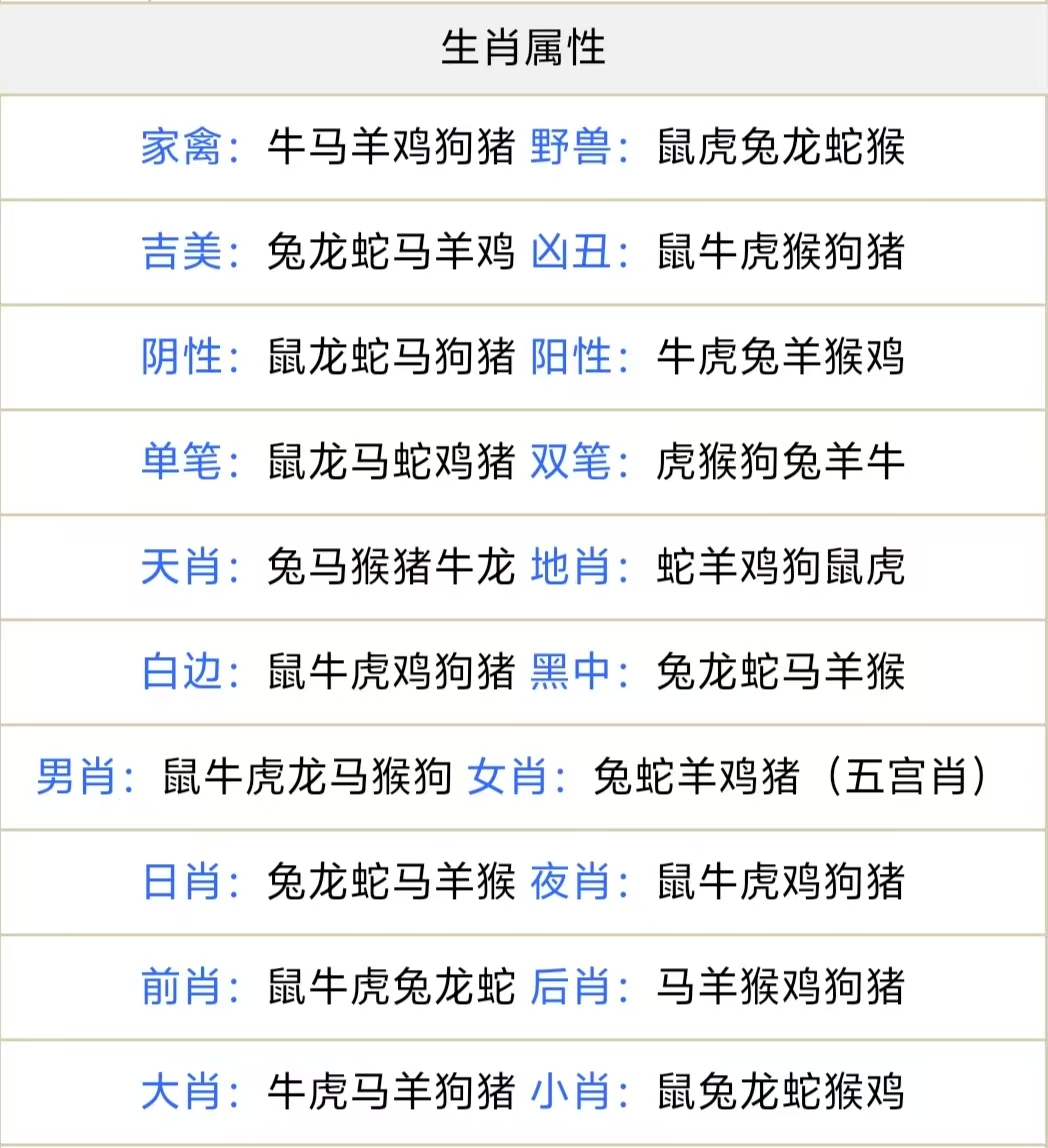 男肖:鼠牛虎龙马猴狗 女肖:兔蛇羊鸡猪